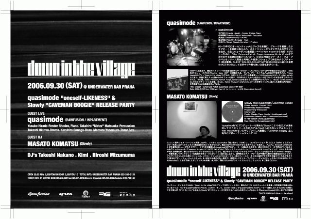 8月の沖野好洋,SLEEP WALKERに続き、レギュラーパーティー”down in the village”がお届けするスペシャルパーティー第二弾を9/30に開催!!レギュラーメンバーに加え、常に様々な音楽をチョイスした折衷的なPLAYが好評のMASATO KOMATSU。そして彼がプロデュースする和製ジャズ・バンド”quasimode”が新潟初上陸を果たします!!いまや絶大な指示を受けているquasimodeを知らない人はまずは聴いてみてほしい!!楽曲を聞いてまず耳に入って来るピアノ。このピアノがものすごくカッコイイ!!気品ある圧倒的Jazzy Vibesにどんどん引きづり込まれ、日本
