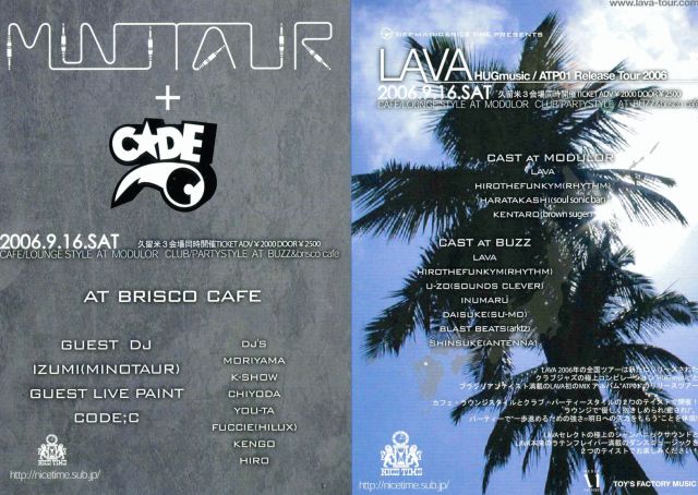 ☆★☆【NICE TIME】☆★☆ 今回の会場は久々の久留米。3会場同時開催で大人のDJ EVENTやっちゃいます。特に19時からのMODULORはお食事なんかも出したりして新感覚のPRATY STYLEでやっちゃいます!!! HP: http://nicetime.sub.jp/ TIME:2006.09.16(土) PLACE:MODULOR&BUZZ&brisco cafe(福岡県久留米市) TICKET:ADV\2.000- DOOR\2.500-(3会場共通チケット制で1枚で全ての会場に入場出来ます。) GUEST: ・DJ:LAVA:http://www.lava.jp/index.html ・DJ:IZUMI(MINOTAUR):http://www.font-net.com/ ・LIVE PA