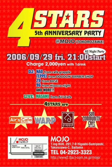 チェケラ♪♪♪ みんなでワッショイしましょっ+。:.゚ヽ(*´∀`)ノ゚.:。+ ○●◎○●◎○●◎○●◎○●◎○●◎○●◎○●◎ 場所 音楽喫茶MOJO http://www.mojo-m.com/ 時間 9/29(金) 21〜All Night LIVE 22:30〜 MASAMI from Air'sCafe DJ 23:00〜 96 23:40〜 DJ神show 24:20〜 29 25:00〜 NAO 25:50〜 TEPPEI 26:40〜 RYO 27:20〜 EISAKU and