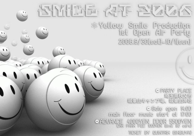 ~Yellow Smile Production 1st open air party~ ■ SMILE AT 2006■ 2006/9/30~2006/10/1(Sat~Sun) @Joumine Camp Ground,Chichibu,Saitama(0494-62-4745) Psychedelic/Progressive/Tribal floor Guest Dj`s □ Kei(Quintrix/Sonic Dragon/Planet B.E.N) □ Wizard ov Elf(ELF music) □ YUO(Starlights rec) □ OZ(Solaris music/Anomaly) □ @raki(Jz Trance) □ Tomoko(Quintrix/Hypnoticportal) □ Tulio(D.Lab) Live set □ Kuromitsu(ELF music/TPE) VS Kei □ Wildrome(NOGA rec/Boost/Extrange) Dj`s □