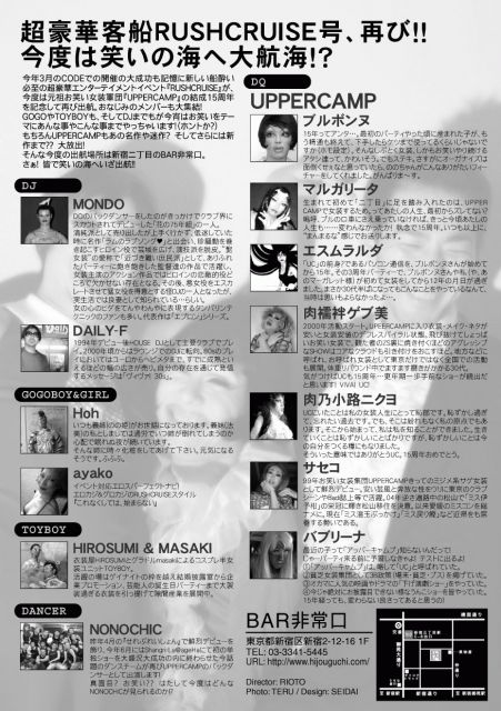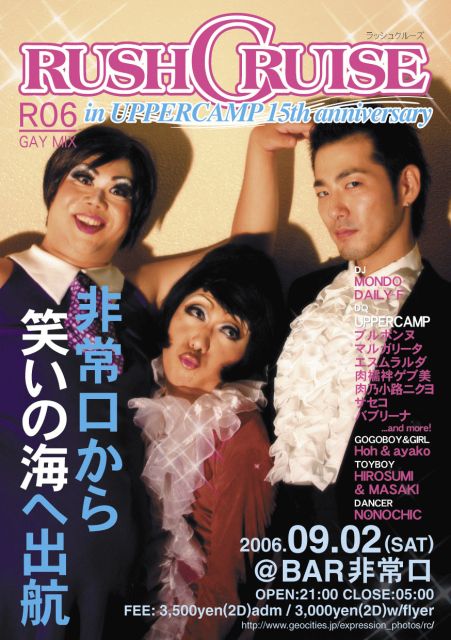 『RUSHCRUISE R06 in UPPERCAMP 15th ANNIVERSARY』 2006.09.02 (SAT) GAYMIX @BAR 非常口 http://www.hijouguchi.com/ OPEN 21:00 CLOSE 5:00 FEE/3500yen:2Drink 3000yen:2Drink(w/flyer) DJ:MONDO,DAILY-F DQ:UPPERCAMP ブルボンヌ・マルガリータ・エスムラルダ・肉襦袢ゲブ美・肉乃小路ニクヨ・サセコ・バブリーナ・ジュヌヴィエーヴ・ワカメ・パラエ・ドリューバリネコ・キムコ&アキエヒルトン GOGOBOY&GIRL:Hoh&ayako,ISE TOYBOY:HIROSUMI&MASAKI DANCER:NONOCHIC --------------- SHOW TIME