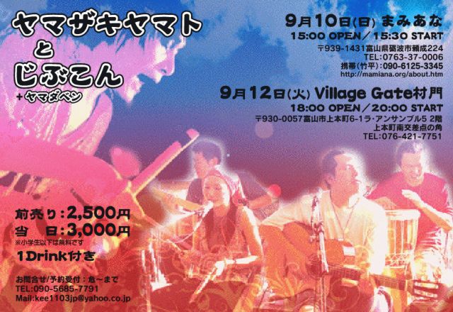 ヤマザキヤマトさんが再び北陸に来ます 今回は、仲良しの『じぶこん』さんと一緒です 最終日の12日は富山市で初ライブ!! なんとゲストに 『サヨコオトナラ』のOtoちゃんも参加です ■ 9月10日(日) まみあな OPEN 15:00 START 15:30〜 前売り2,500円 当日3,000円 1ドリンク付き ※小学生以下は無料です 場所 まみあな http://mamiana.org/ 富山県砺波市 頼成224 竹平(携帯)090-6125-3345 TEL : 0763-37-0006 ■ 9月11日(月) 白山虹の祭 石川・白山市 獅子吼高原(スカイ獅子吼 )