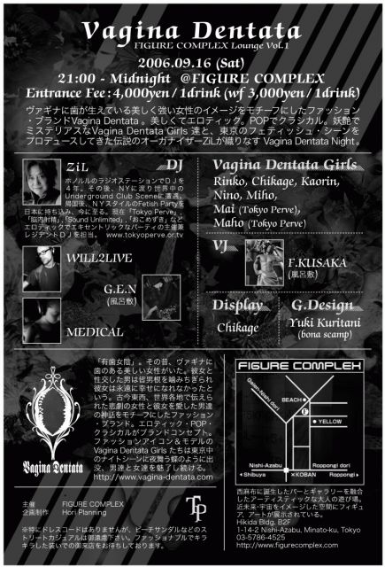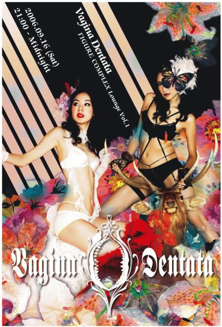 http://www.vagina-dentata.com 「有歯女陰」。 ヴァギナに歯が生えている女性たちが、オトコを次々に狩猟していく。 世界各地に残る神話をモチーフに、男たちに媚ない、強いオンナのエロティシズムをイメージしたファッションブランド “ Vagina Dentata “。 そのVD がイベントとなって、ウワサのギャラリー・ラウンジ、西麻布 Figure Complexに登場します。 Vagina Dentata Girlsが繰り広げる、エロで、ポップで、クラシカルなファッションをTokyo Undergroundシーンで活躍するDJたちが怪しく、妖しく、盛り上げるSexy Night。
