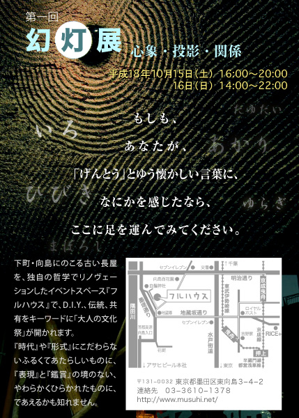 10/14(土)〜10/15(日)に、 フルハウスで第一回『幻灯展』が行われます。 それに先駆け、 企画書の受付、プログラム作り、進行、飲食メニュー、 スタッフィングなどの打ち合わせと、 はじめてこられる方の下見と懇談会をかね、 顔合わせパーティーと日本映画の上映会を致します。 映画は「日本橋」 泉鏡花、市川崑、淡島千景、山本富士子、若尾文子 http://movie.goo.ne.jp/movies/PMVWKPD25019/ 時間あれば「鯨神」も。 とりあえず、 いろいろ、かおあわせて、はなしてみようじゃ、