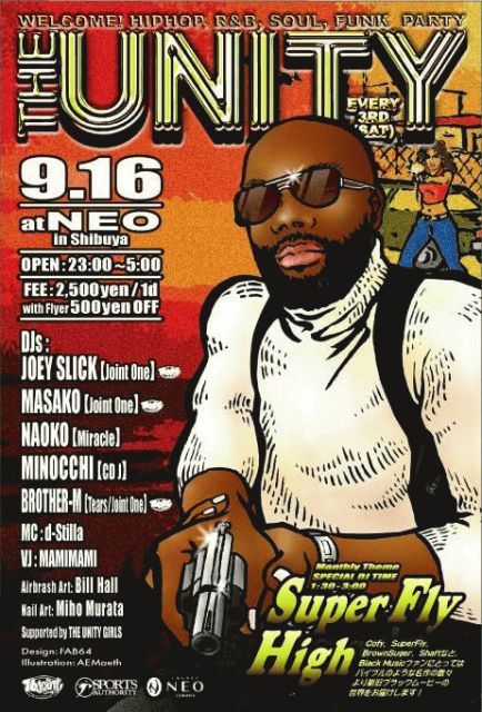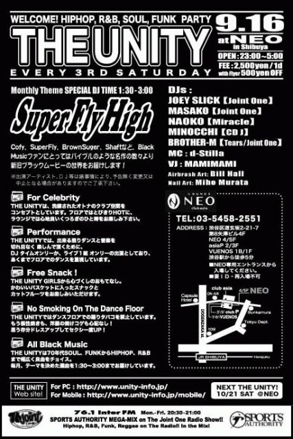 ☆9月の"THE UNITY" は9/16(Sat)に開催しま〜す! (毎月第3土曜日開催中!) ☆9月のテーマタイム(AM 1:30-3:00予定)は"Super Fly High"です。ブラックシネマ特集!Old School定番の♪Super Fly、♪Shaft、♪Car Wash から,♪New Jack City、♪Friday、そして♪Barbershopなどの最近のものまで、ブラックシネマのOSTの中からお届け!ミニライブは、LAから来日する日系ラッパー”XL Middleton”がThe UNITY初登場デス☆ また、XL Middletonの前に約10分間、11月フルセット出演予定のトークボックスKSK The Oneもプロモ登場決定!!ヤバいメン