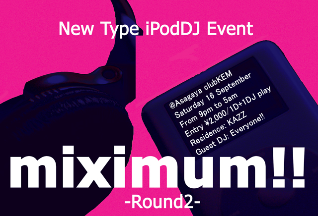 【miximum!!とは?】 レコードやCDの代わりに、iPod等といったDigital Audio Playerをミキサーに接続し、DJプレイを行うイベントの一つ。 一番の特徴は「参加者なら誰でもDJになれる」事。 エントランスで入場料を払う際に番号札が貰えます。 ↓ スクリーンに自分の番号が映し出されたら、自分のiPodを持ってDJブースへGO! ↓ ミキサーに自分のiPodを接続し、好きな曲を流すだけ!! ↓ ミキサーを使って隣の人と1曲ずつ交互に流します。 ↓ 3回流したら終了して次の番号の人とバトンタッチです。 簡単だし、スタッフもサポートします