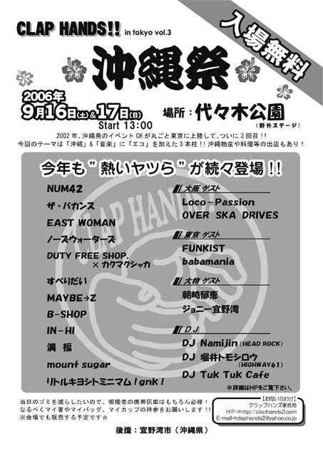 ■クラップハンズin東京vol.3『沖縄祭(仮)』企画書■ 今程「インディーズ」が注目されていなかった頃、 まだまだ水面下にいた沖縄のアーティスト達を広く紹介しようと ‘99年に沖縄で野外無料で始まったイベント「ClapHands!!」(以下CH) 以来3枚のコンピCDをプロデュース、のべ37組の楽曲を全国に流通、 「沖縄インディーズの母」とも呼ばれたKEN子率いるCHが、 「更に意義あるイベント制作」に挑みます。 3度目の東京、今回のコンセプトは… 「地球回復の為にできる事からやってみよう!!」 ◆企画概要◆ マイ箸マイバッグのKEN子曰く
