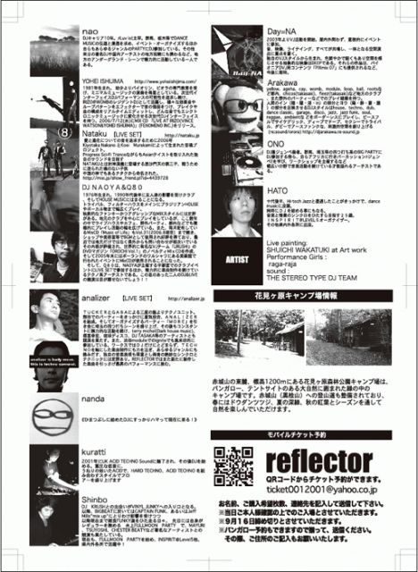 管理人様、告知させてください。 宜しくお願いします。 【【 REFLECTOR@花見ヶ原キャンプ場 】】 群馬の赤城山北東の標高1200m、花見が原森林公園(キャンプ場)で開催!! 東北自動車道 佐野藤岡ICから90分、関越自動車道 沼田ICから40分の 場所です。(夜は神秘的、朝は幻想的な場所です♪) ※詳細、地図はオフィシャルHPへ⇒http://analizer.jp/ ――――――――――――――――――――――――― 強力なインパクトを持つクリエーター集団が新しい動きで作り出すテクノ・ハウスを軸とした野外パーテーィ! プロ
