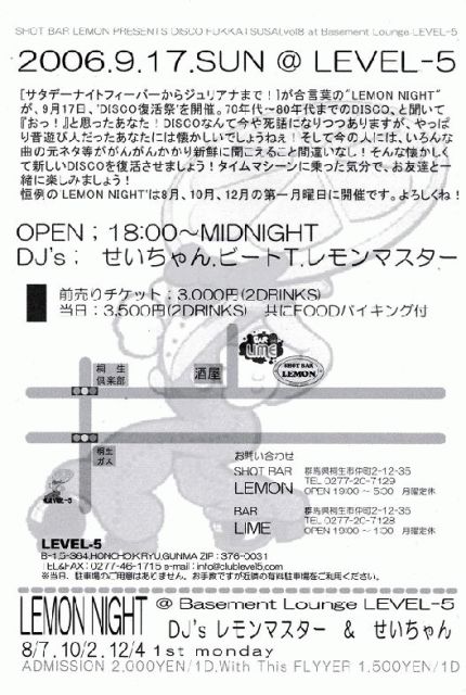 やっと決定しました! 次回のDISCO復活祭は9月17日(日)です。 日曜だけど、次の日が旗日だから大丈夫だよねぇ? ☆DISCO復活祭☆ 〜サタデーナイトフィーバーからジュリアナまで〜 日時 9月17日(日曜日) 18:00〜midnghit 場所 LEVEL-5 桐生市本町5-364 B1 TEL : 0277-43-5599 http://www7.wind.ne.jp/LEVEL5/ 料金 前売り3000円(当日3500円) 2DRINK,フードバイキング付 チケット問合せ SHOT BAR LEMON 桐生市仲町2−12−35 TEL0277-20-7129