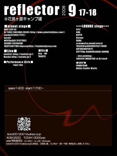 2006/09 /17-18 ■open/14:00/start/17:00■ ■ADM2500yen/today3000yen @花見ヶ原キャンプ場 http://www.city.kiryu.gunma.jp/web/home.nsf/10721ebeb31f439e492568f9002e676c/8f1fbcf789569a604925700b0004c09b?OpenDocument --planet stege-- NAO (LUV IS) DJ YOHEI ISHIJIMA (IRIZO) (http://www.yoheiishijima.com/) nanda(STEREO TYPE ) kuratti NAOYA&Q80 (PICTURE) SHINBO (FULMOON) TAZZY(RHYTHM Odyssey) http://rhythmodyssey.com ===LOUNGE stege=== K@Z ONO NIPPO Kazuya BABA arakawa(r