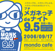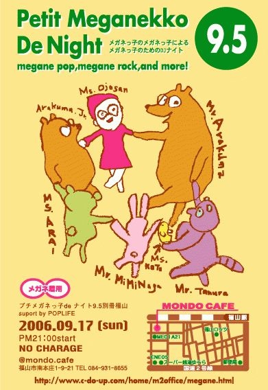 メガネッ子の、メガネッ子による、 メガネッ子のためのDJナイト sea cake style@広島で大人気のこのイベント。 9回目も満員御礼!次回は祝10回目! その前に、メガネっ子初遠征!in福山 福山の人気イベントPOPLIFEさんたちの サポートの元、 心境の地で新たなるプチメガネっ子deナイト☆ ロックポップetc洋邦問わずオールジャンル! お気に入りのメガネ着用で、モンドカフェに集合! ********************************************* プチメガネッ子deナイト9.5 別冊福山 suport by POPLIFE 2006.9.17.sun (三連休