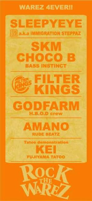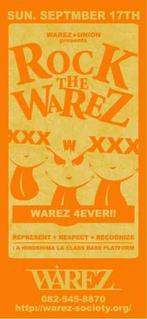 そうです。 このコミュニティーの管理人でもあり。 広島のDRUMANDBASSを支えてきた【WAREZ】が 1つのシーンに終わりを告げます。 そして今までの多大なる感謝の気持ちをこめてささげる。 【WAREZ 4 EVER】 これからも広島のDRUMANDBASSをよろしく!!! SKM a.k.a DEAFSOLDOER ------------------------------------ ■2006*9*17 (SUN)■ @SEXUAL APEDITE START 21:00 □CUST□ ☆FILTERKINGS☆ ☆SLEEPYEYE☆ ☆BASSINSTINCT☆ SKM aka DEAFSOLDIER CHOCO-B ☆H.B.O.D☆ GODFARM ☆RUDE BEATZ☆ AMANO