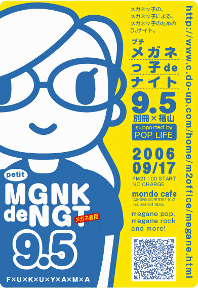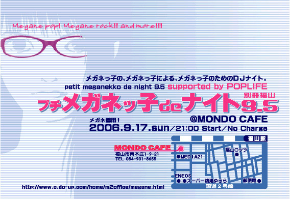 広島市で半年に1回開催されて9回を数えたメガネっ子でナイトが遂に福山で開催! 広島県東方面はたまた岡山県の人もぜひ! ちなみに前回はくるりが4曲プレイされました! 前回までのセットリストはHPやコミュでチェック! http://www.c.do-up.com/home/m2office/megane.html http://mixi.jp/view_community.pl?id=396099 メガネッ子のメガネッ子によるメガネッ子のためのDJナイト petit meganekko de night 9.5 プチメガネッ子deナイト9.5 別冊福山 supported by POPLIFE megane pop,megane rock,and more! 2006.9.17.sun