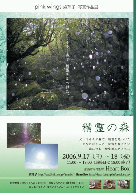 光ふりそそぐ森で 精霊を見つけた あなたに そっと 秘密を教えたい 森に住む 精霊達の声と共に pink wing 麻理子 写真作品展 「精霊の森」 わたしの大の仲良し麻理子たん・初の個展をHeart Boxでさせていただくことになりました。 わたしも同行した旅での写真もたくさんあるので とっても感慨深いのですよん♪ 日程:2006年9月17日(日)〜18日(祝) 時間:11:00〜19:00(最終日は、18:00終了) 17日には、のんちゃんカ