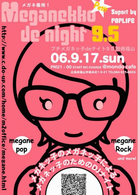 〜プチメガネッ子deナイト9.5 別冊福山 supported by POPLIFE〜 広島でお世話になっているイベント「メガネッ子deナイト」が福山で開催されます。しかも、POPLIFEが全面サポートです。 当日は、私240とKIMくんが、参加する予定。 POPLIFEの翌週もモンドカフェに集合!! ↓コミュもあります。 http://mixi.jp/view_community.pl?id=396099 以下、引用。 メガネッ子の、メガネッ子による、メガネッ子のためのDJナイト 広島市内シーケークスタイルにて大人気中のこのイベントが! 広島の東部でもぜひ開いて!との多数リクエスト