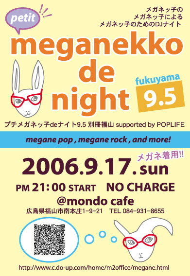 メガネッ子の、メガネッ子による、 メガネッ子のためのDJナイト 広島市内シーケークスタイルにて大人気中のこのイベントが! 広島の東部でもぜひ開いて!との多数リクエストにお答えして♪ 別冊プチメガネのイベント開催、決定しました☆☆☆ ****************************** 2006.9.17.sun PM21:00 START NO CHARGE @mondo cafe 広島県福山市南本庄1-9-21 TEL084-931-8655 ****************************** メガネロック☆メガネポップ♪ メガネダンス
