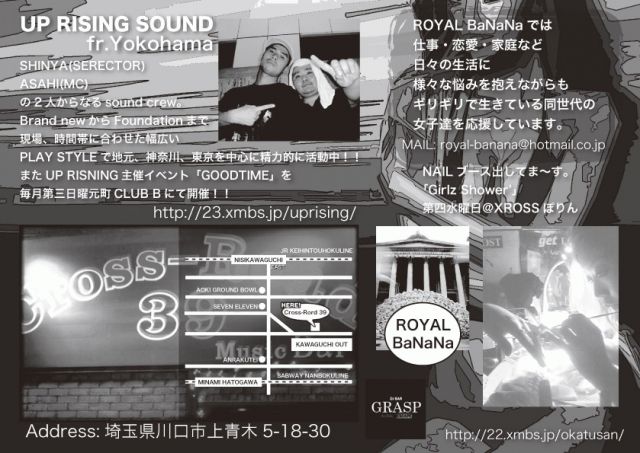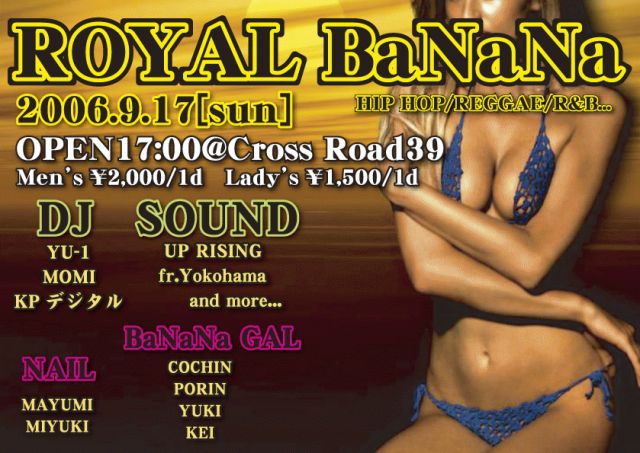 OPEN17:00〜23:00 MEN's\2000/1D LADY's\1500/1D HIPHOP,REGGAE,R&B ♪ ★DJ★ MOMI KPデジタル YU-1 ★GUEST SOUND★ -SPICY CHOCOLATE- UP PISING fr.yokohama RED STRIPE fr.saitama ★NAIL★ Mayumi Miyuki ROYAL BaNaNa・HP http://x11.peps.jp/royalbanana/ 事前にご連絡頂ければディスカウントゲスト取ります★ お気軽に♪ MAP http://www.mapion.co.jp/c/here?S=all&F=mapi3113025060905093106