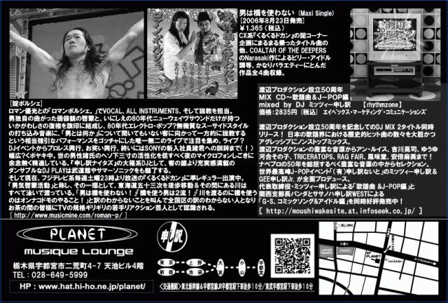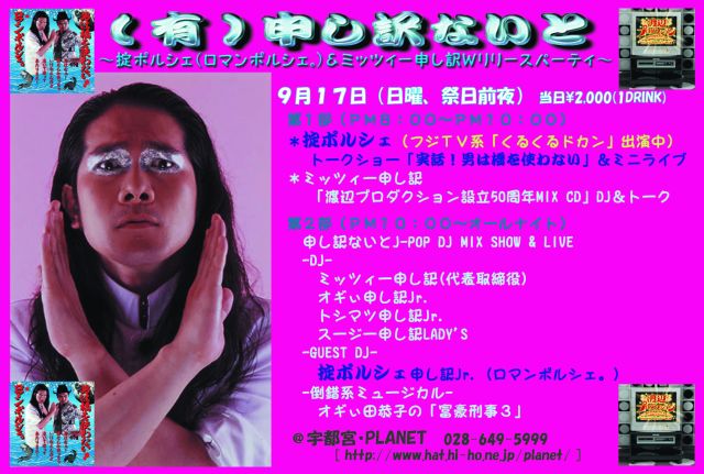 (有)申し訳ないとSP 〜掟ポルシェ(ロマンポルシェ。)&ミッツィー申し訳Wリリース・パーティ〜 OPEN-20:00~ALL NIGHT / \2,000(1D) @宇都宮PLANET[ http://www.hat.hi-ho.ne.jp/planet/ ] 第1部(PM8:00〜PM10:00) *掟ポルシェ・トークショー(フジTV系「くるくるドカン」出演中) 「実話!男は橋を使わない」&ミニライブ *ミッツィー申し訳 「渡辺プロダクション設立50周年MIX CD」DJ&トーク 第2部(PM10:00〜オールナイト) *申し訳ないとJ-POP DJ MIX SHOW & LIVE -DJ-