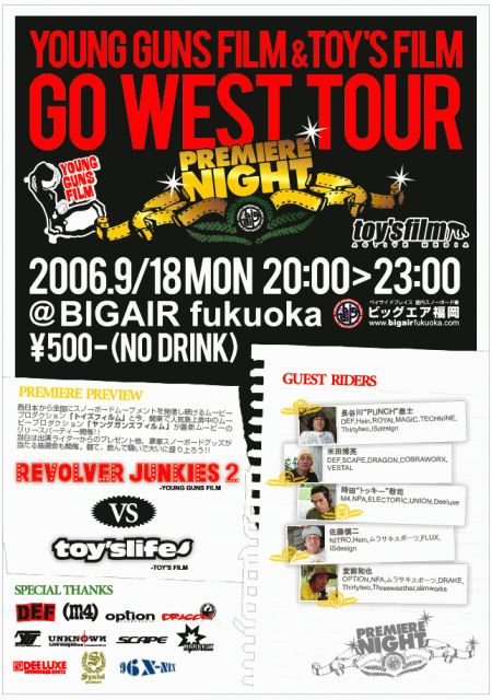 関東で今、人気急上昇中のヤングガンズフィルムと、西日本からムーブメントを発信し続けるトイズフィルム、この2つのムービープロダクションが新作ムービーを引っさげて西日本の室内ゲレンデで試写会イベントを開催!