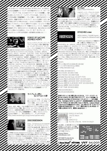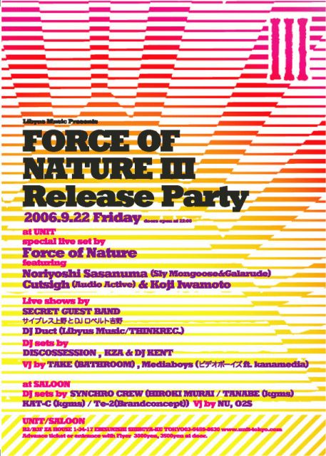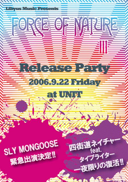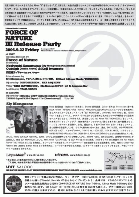 3rd Album "III"を引っさげ、30カ所以上にも及ぶ全国縦断リリースツアーを只今敢行中のフォース・オブ・ネイチャー!今ツアーでは、DJに加えてライブ・セットも初披露し、大盛況に終わったフジロック・フェスティヴァルも含め、そのパフォーマンスが日本全国にて話題沸騰中!そして遂に!!東京では今までベールに包まれ、話題のみ先行していたライブ・セットの全貌が、9/22(金)@代官山UNITにて明らかになる!さらにこの日限定で、アルバムに参加してくれたミュージシャン達をゲストに迎え、"DJとバンドの融合"をテーマに、大規模なセットで「究極の