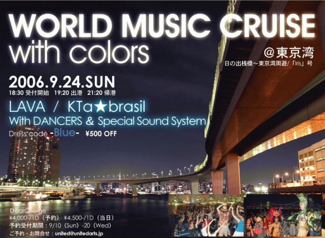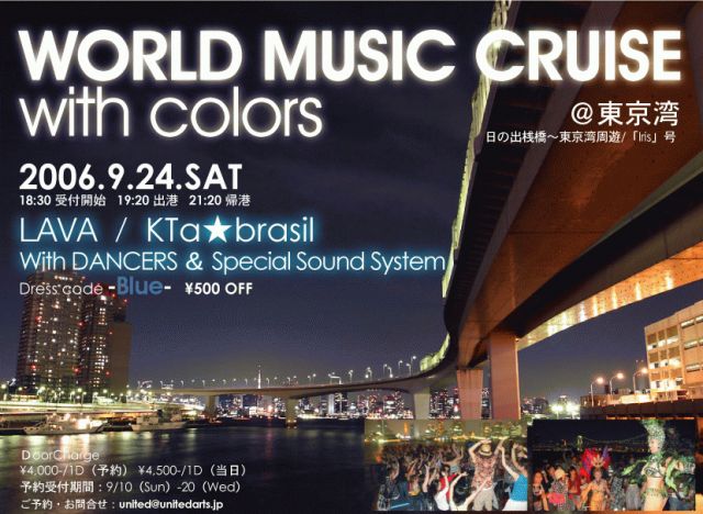 今回は、前回7月のパーティが大好評だった【WORLD MUSIC CRUISE with colors】第二弾です!東京湾クルージングパーティ(船上クラブパーティ)またまた、やっちゃいます!サンバのリズムで盛り上がりながら、東京湾を優雅にクルージング。オープンデッキから眺める東京タワー・汐留・お台場の夜景はまさに絶景!おまけに普段あまり観る事ができない、あのレインボーブリッジを真下から見上げる事