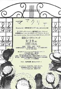 ■いよいよあさってとなりました、三ヵ月ぶり松本里美のソロLIVEです。 http://www.saboten.biz/06mama-punch.html 2006年9月28日(木曜日) 荻窪『ビストロ サンジャック』 http://pomkn.cocolog-nifty.com/kikaku/2006/08/post_c5f6.html 杉並区天沼3-32-1 メゾン荻窪103 03-3393-2639 open/18:30 start/19:30 2500 yen+1ドリンク <小さなオードブル付き> mama clio 一周年記念ライブ 〜 楽しい音のおもちゃ箱 〜 15人編成の脱力系ビッグバンド "パスカルズ "のバイオリン隊のおひとり クリスチィヌさんリードのmama