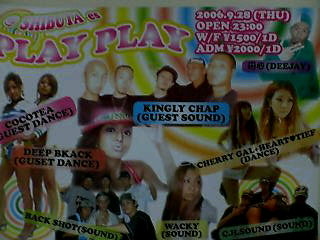 9月28日(木) @SHIBUYAes OPEN23:00 DOOR2000/1D W/F1500/1D GUESTSOUND ・KINGLYCHAP GUESTDANCER ・COCO TEA ・DEEP BLACK SOUND ・C.H.SOUND ・BACK SHOT ・WACKY DANCER ・CHERRYGAL+HEART TIEF 〒150-0045 東京都渋谷区神泉8-1鈴屋ビルB1 TEL03-5728-8380 毎月第4木曜日はPLAYPLAYにぜひ! オ-プンダンス&オープンマイクあり!