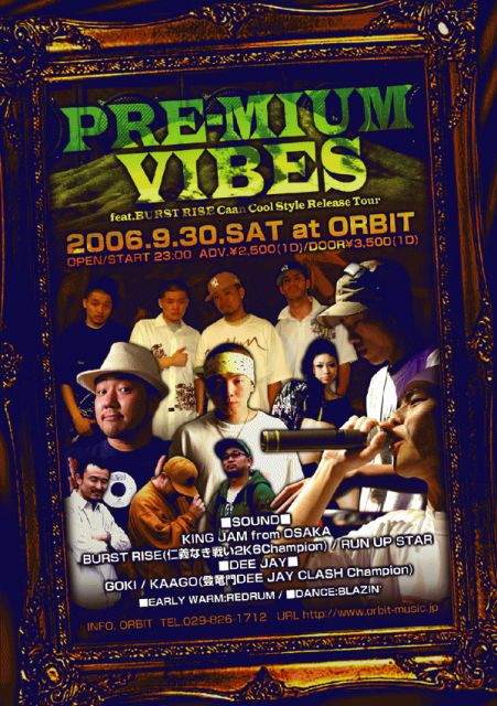 明日土曜は茨城の土浦で前回EVERTON BLENDER fr JAを呼んだ好評なPRE-MIUM VIBES♪ 今回はBURST RISEのCDのRELEASE TOURです。その他の出演者も大阪よりKINGJAM,横浜からはGOKI,KAAGO,東京よりはREDRUM、その他豪華にお送りしています★近くの方は是非遊びに来て下さい!!! 2006.9.30(Sat) PRE-MIUM VIBES at ORBIT -BURST RISE 1st Mix CD 『Caan Cool Style』Release Tour- OPEN/START 23:00 FEE:ADV¥2500/1d DOOR¥3500/1d <LIVE> GOKI fr YOKOHAMA KAAGO(登竜門Dee Jay Clash 2K6 Champion) fr YOKOHAMA <DANCER> B