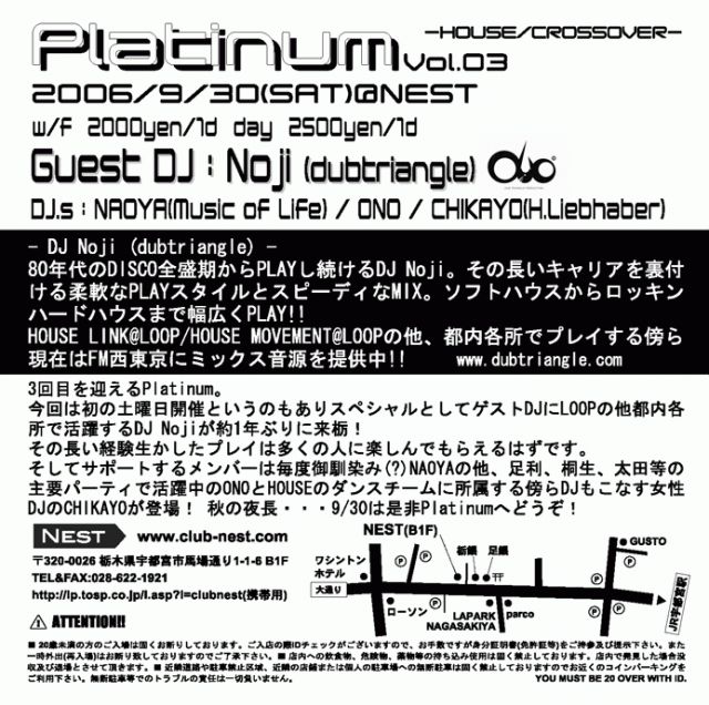 9/30(SAT) Platinum Vol.3 @ NEST open 22:00 adv&w/f \2000/1d day \2500/1D Guest DJ / Noji(dubtriangle) DJ.s : NAOYA(Music of Life) / ONO / CHIKAYO(H.Liebhaber) 3回目を迎えるPlatinum。 今回は初の土曜日開催というのもありスペシャルとしてゲストDJにdubtriangle主催であり、LOOPの他、都内各地で活躍するDJ Nojiが約1年ぶりに来栃! その長い経験を生かしたプレイは多くの人に楽しんでもらえるはずです。 そしてサポートするメンバーはPlatinum唯一のレジデンツDJであるNAOYA、栃木群馬と各所の主要パーティで活躍中