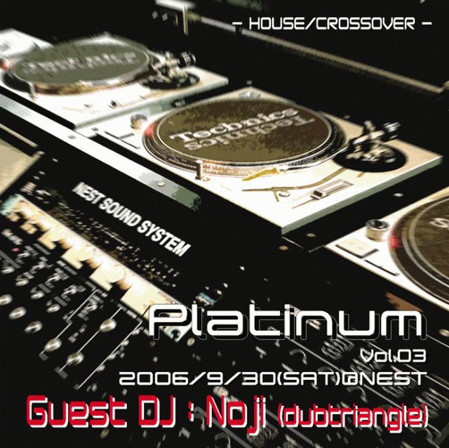 9/30(SAT) Platinum Vol.3 @ NEST open 22:00 adv&w/f \2000/1d day \2500/1D Guest DJ / Noji(dubtriangle) DJ.s : NAOYA(Music of Life) / ONO / CHIKAYO(H.Liebhaber) -DJ Noji plof- 80年代のDISCO全盛期からPLAYし続けるDJ Noji。 その長いキャリアを裏付ける柔軟なPLAYスタイルろスピーディーなMIX。 ソフトハウスからロッキンハードハウスまで幅広くPLAY!! HOUSE LINK@LOOP / HOUSE MOVEMENT@LOOPの他、都内各所でプレイする傍ら、現在はFM西東京にミックス音源を提供中!! 3回目を迎えるPlatinum。 今回は