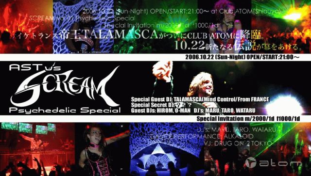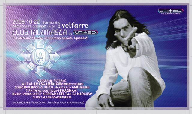 タラマスカ de アゲマスカ?帝王TALAMASCA活動10年の歴史がココに集約!サイケトランスシーン初の試みとなる CLUB TALAMASCAシリーズ第1回公演はゲストにMIND CONTROLからSHAGMAが、更にはシーン屈指のパイオニアX-DREAM&DELTAのDJ MARCUSがCLUB TALAMASCAに華を添える。