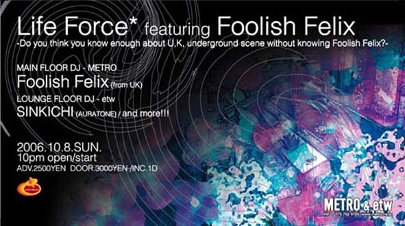 現在進行形の伝説と化しているハウス・パーティー「ライフ・フォース」。不定期かつ開催場所も不特定(山奥だったり、ヒマラヤだったり)、告知方法もフライヤーが少量撒かれるのみだったり、口コミだったりと、非常にアンダーグラウンド的姿勢であるにも関わらず、DJプレイのみならず、幻想的な照明、ビジュアルと内装、特別な音響シ