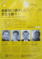 安曇野に根ざした文化を創ろう!! 〜美術・音楽・演劇・映画・自然の連携は可能か〜 本年は上記テーマで開催予定です。 その他の情報は以下の通りです。 ■出演:【パネリスト】串田和美 氏(まつもと市民芸術館 館長兼芸術監督)/片山壮二 氏(国営アルプスあづみの公園 事務所長)/赤廣三郎 氏(前サイトウキネン・フェスティバル松本実行委員会事務局長) 【コーディネーター】安曇野ちひろ美術館館長 松本猛 氏 ■申込方法:直接会場へお出掛けください。 ■定員:200名 ■参加費:無料 是非ご参加ください。