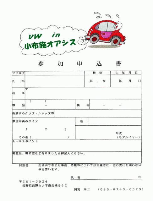 「VW in 小布施オアシス」 開催日時●10月29日(日) 8時〜 場 所 ●長野県上高井郡小布施町「小布施HiWayオアシス」 (上越自動車道路の信州中野ICから7分/須坂長野東ICから1 5分) 対象車種●空冷VW,New Beetle,空冷VWレプリカ車 参加費 ●1台1000円(スワップミートは展示車の前の2.5x2.5スペースにて可) 当日は園内にて小布施町のイベントがあり、参加VWは公園内の遊歩道に展示します。 園内には子供広場にジャングルジム等遊具もあり。愛犬の参加もOK. お食事は園内にレストランがあり