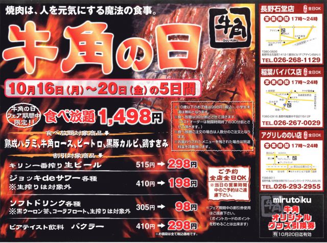 長野駅前の「牛角」で焼き肉食べ放題フェア開催中です。 金曜日の夜、行きませんか?? 予約しますので、参加される方はお早めにどうぞ!! 飲み物はワリカンではなく自分の飲んだ分だけ負担しましょう。 飲まない人が不公平にならないように…
