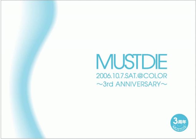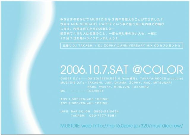 いよいよです!! MUSTDIE三周年のANNIVERSARY PARTYですよよよ。 若い力で(俺含む)佐世保の町を盛り上げましょう★ コミュ参加者は特典ありなんで是非ぜ〜ひ!! http://mixi.jp/view_community.pl?id=1314967 2006.10.07.SAT@COLOR ■MUSTDIE■ 3rd ANNIVERSARY ■GUEST DJ DAIZO(SEEDLESS G) TAKAYA(ROOTS products) ■MUSTDIE DJ's TAKASHI JUN OYAMA ZOPHY NAO MITSUNARI NABE WAKKY MIHOJUN TAKAHIRO ■MC TOSHIKEY ■TICKET 1500YEN(w1D) 2000YEN(w1D) 先着で