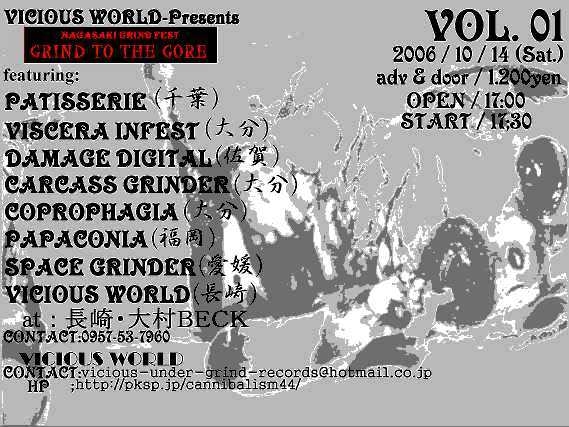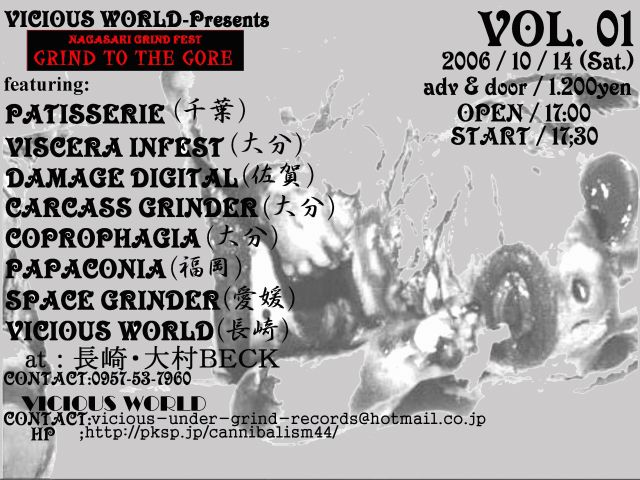 VICIOUS WORLD.presents 〜GRIND TO THE GORE〜 10月14日(土) 長崎・大村BECK 出演BAND(予定) *PATISSERIE(千葉) *CARCASS GRINDER(大分) *DAMAGE DIGITAL(佐賀) *VISCERA INFEST(大分) *COPROPHAGIA(大分) *PAPACONIA(北九州) *VICIOUS WORLD(長崎) *SPACE GRINDER(愛媛) *and more.... VICIOUS WORLD http://pksp.jp/cannibalism44/