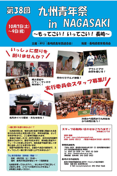 今年の九州青年祭は、長崎県・佐世保を中心に行われます。みなさんのご参加をお待ちしています。 4/22(土) 15:00〜 プレ実行委員会(説明会) 長崎大学生涯学習教育研究センター 詳細:http://mixi.jp/view_event.pl?id=5623237&comm_id=754911 九州青年祭inNAGASAKI実行委員会コミュニティ http://mixi.jp/view_community.pl?id=754911 九州青年祭inNAGASAKI presented by NYU Webコンテンツ http://www.kamome.sakura.ne.jp/dan/index.php?%B6%E5%BD%A3%C0%C4%C7%AF%BA%D7