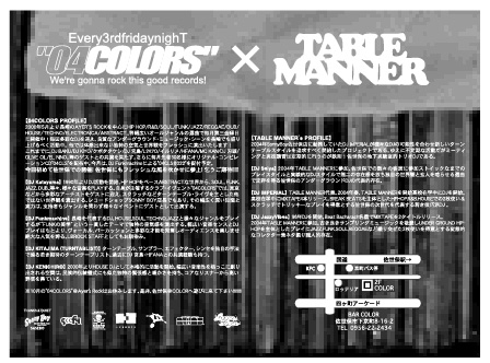管理人様、はじめまして。イベント告知、失礼致します。 毎月第三金曜日に長崎エアーズロックにて行われいるクラブ・イベント"04COLORS"が、佐世保を代表するイベント、「TABLE MANNER」とBAR「COLOR」の協力の下、"04COLORS" × TABLE MANNER が開催される事が決定いたしました! "04COLORS" × TABLE MANNER 2006.10/14 (SAT.) @COLOR (SASEBO) 9PM OPEN ADV. 1500YEN (1 DRINK) / DAY. 2000YEN (1 DRINK) FEATURING... "04COLORS"DJ'S DJ KATAYAMA/DJ FUNKMACHINE/DJ KITAJIMA/DJ KENICHIRO TABLE MANNER DJ'S D