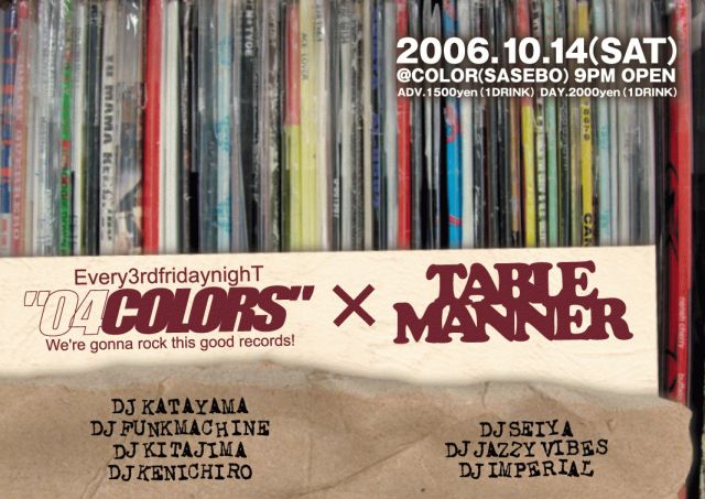 さて、知ってる方も少なくは無いと思いますが、来月の"04COLORS"は何と!佐世保にて開催いたします。いえー!! この度、佐世保を代表するアングラ・イベント、「TABLE MANNER」とBAR「COLOR」の協力の下、開催される事が決定いたしました!マジ、サンクスです!ビゴッ!! 以下、詳細DEATH !!! "04COLORS" × TABLE MANNER 2006.10/14 (SAT.) @COLOR (SASEBO) 9PM OPEN ADV. 1500YEN (1 DRINK) / DAY. 2000YEN (1 DRINK) FEATURING... 04DJ'S DJ KATAYAMA/DJ FUNKMACHINE/DJ KITAJIMA/DJ KENICHIRO TABLE MANNER DJ'S