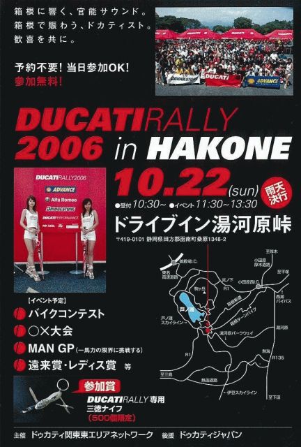 詳細はそのうちここにのると思います。 http://www.ducati.com/od/ducatijapan/jp/events/detail.jhtml;jsessionid=EMREPOUDFVE3ACRNCB2SFEYKFUIHUIV3?eventId=10201