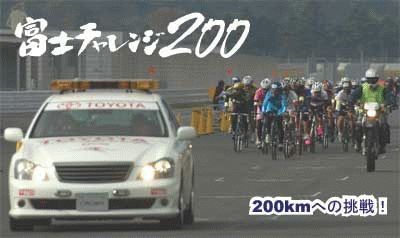 □大会名: 第4回 富士チャレンジ200 in FUJISPEEDWAY □開催日: 2006年10月29日(日) □会 場: 富士スピードウェイ(静岡県小山町) http://www.fsw.tv/ □主 催: 富士チャレンジ200大会実行委員会(小山町、ランナーズ) □協 力: 富士スピードウェイ □企画・運営: ランナーズ/funride □募集期間: 2006年9月20日(水)まで ※但し、各種目定員になり次第締め切ります。 1. チャレンジ200 (ソロ種目) 制限時間7時間で200km走行を目指す。第3回大会の完走率は68%。 参加料:12,000円 参加資格:高校生以上
