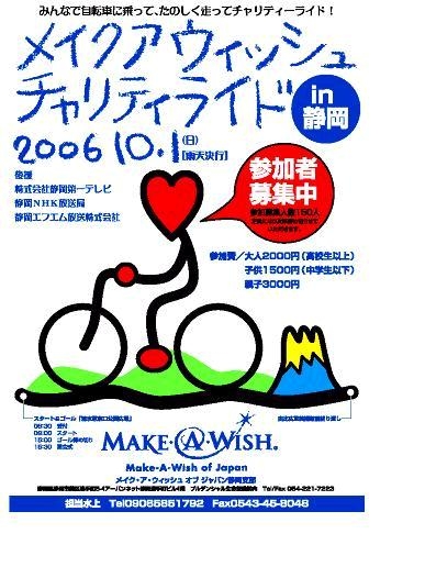 10/1に静岡の清水〜由比を往復するチャリティーライドが開催されます(http://plaza.across.or.jp/~alpine/index.html)。 当日はライドに併せて、新静岡⇔新清水間(静岡鉄道)をサイクルトレインが運行されます。 景色のよい海沿いのサイクリングロード&旧東海道の町並みの中約23kmをのんびり走るチャリティーライドです。 参加費は大人2000円、子供1500円。 主催:メイク・ア・ウィッシュ・ジャパン 静岡支部 協賛:静岡第一テレビ・NHK静岡放送局・静岡エフエム放送 なお、参加費から運営経費500円を差し引いた残り全額がメイク・