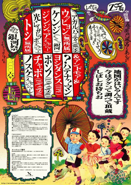 細かな部分(DJ等も含め)まだまだ決まってないところありますが、場所日付は決定です! >>>>MESSENGER"サイケデリック銀河祭"<<<<< 2006年10月7日 オートキャンプ銀河 裏面も完成!DJはこんな感じ!デコとVJはこいつ! え〜早めに文章に致します。今夜は遅いため。グンナイ! 詳細変わったら大目に見てくださいませよろしくお願い致しまし。 もろもろ決まり次第じゃんじゃん更新していきます!
