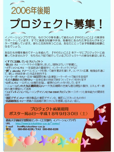 イノベーションプラザでは、ものづくり等を通して皆さんの『やりたいこと』の実現をサポートしています。すでに高度な知識や手技、独創性にあふれた学生さんが本センターで活動しています。彼らと交流を持つことは、あなたにとって必ず有意義な経験となるでしょう。 あなたも仲間を集めてチームを組んで、『やりたいこと』をテーマにプロジェクトに応募してみませんか? もちろん下記で紹介しているプロジェクトへの参加も歓迎します。 <すでに活動しているプロジェクト> ・新LED PJ …バーサライトを製作しました。現物はガレリア新蔵に