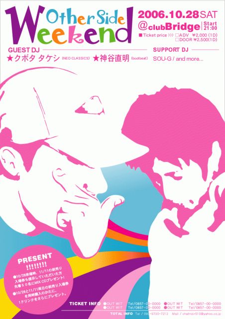 さて、ひと月前になりました。 そろそろ町中でフライヤー、ポスターを見かけて 下さった方もいるんでは無いでしょうか? (・・・と言うか見てください。来てください) 『OTHER SIDE WEEKEND』 10/28(土)BRIDGE@鳥取 21:00START ADV\2000(1D)DOOR\2500(1D) ゲストDJ クボタ タケシ(NEO CLASSICS) 神谷直明(bootbeat) SUPPORT DJ Sou-g etc 美味しいお酒を飲みながら楽しく踊ったり騒いだりしに 気軽に来て下さいね。 チケットは コスモ各店さん アウトウィットさん