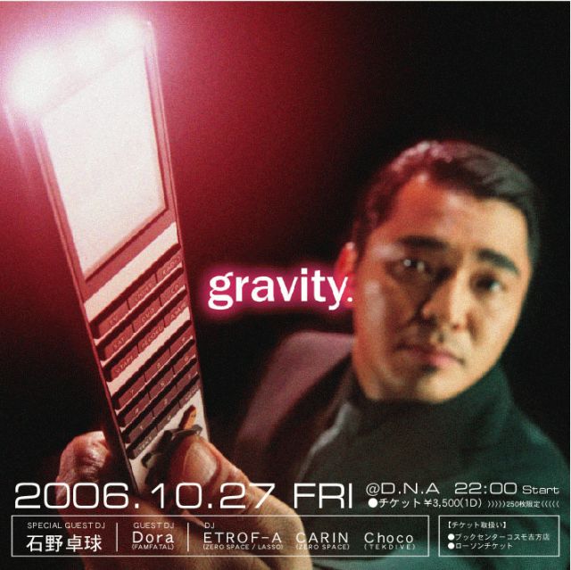 管理人さん勝手ではありますが失礼致します。 鳥取の音楽イベントをもっと盛り上げたく 色々なDJイベントをやっている『gravity』と申します。 ---------------------------------------------- 10月27日(金) 鳥取市:club D.N.A 22:00〜 ■Ticket price>>□ADV:3500yen(1D) □3500yen SPECIAL GUEST DJ: 石野卓球 GUEST DJ: Dora(FAMFATAL) DJ: ETROF-A(ZERO SPACE/LASSO) CARIN(ZERO SPASE) Choco(TEKDIVE) チケット販売は、10月10日より ローソンチケット・ブックセンターコスモ各店にて 会場の収容人