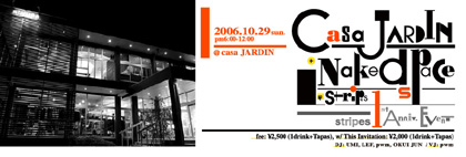 NAKED SPACE OUT! CASA JARDINとNAKED SPACEがお送りする Stripesの1周年期間イベントです。 当日はラウンジな雰囲気で楽しい時間の過せるPartyになりそうですので、 お気軽にご参加ください♪ 当日はVJも入り☆ Tapas(軽いおつまみ)も用意してお待ちしています!! [ CASA JARDIN + NAKED SPACE - Stripes 1st Anniv. Event- ] DATE: 2006.10.29. SUN 18:00-24:00 VENUE: CASA JARDIN DJ: UMI, pwm, LEF, OKUI JUN VJ: pwm FEE: DOOR 2500YEN w/1d+Tapas WITH INVITATION 2000YEN w/1d+Tapas