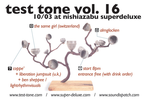 来月のTest Toneは海外のユニークなアーティストたちと共に本拠地スーパーデラックスに戻ってきます。10月3日、ヨーロッパからノイズサウンドを運んで即興デュオThe Same Girl、個性派火星人ボーカリストCoppe'とヴィジュアルマスターBen SheppeeとUKのLiberation JumpsuitのメンバーSmack Mirandaとの最強タッグ、日本人デュオAlmglockenのボイス&ラップトップサウンドなど感動する事間違いなし。お見逃しなく。