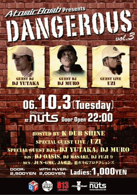 K DUB SHINE、DJ OASIS、JUN-GMCを始めとするアトミックボムのクルーが、毎回多彩なゲストDJ、ゲストMCを迎え、毎月第一火曜日のNUTSをロックするDANGEROUS。第一弾のDJ KAORI、そして第二弾のDJ MASTERKEYに続く第三弾のゲストDJは、DJ YUTAKAとDJ MURO!! スペシャルライブに8月に3rdアルバムをドロップしたUZIを迎えてお送りします! DANGEROUSでしか実現しない夢のような共演、お見逃しないように!